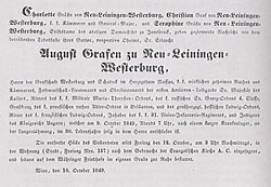 | August Georg zu Leiningen-Westerburg-Neuleiningen, Todesanzeige | self-made, own scan from own old paper from 1849 | Joachim Specht | Datei:August Georg zu Leiningen TodesanzeigeJS.jpg | |
