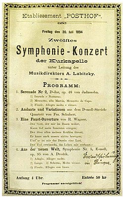 | Programmzettel des Konzerts vom 12. Juli 1894 in Karlsbad, mit dem korrekten Vermerk der europäischen Erstaufführung der 9. Sinfonie ("Aus der Neuen Welt") von Antonín Dvořák, Dirigent: August Labitzky | http://www.postovnidvur.cz/cs/historie/ | Autor/-in unbekannt Unknown author | Datei:August Labitzky koncert.jpg | |