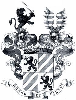 1815: Quadrierter Schild. 1 und 4 in Gold ein schwarzer zum Kampfe gerichteter Löwe, welcher ein Schwert in seiner rechten Pranke hält. 2 und 3 in Rot drei linksschräge silberne Balken. Den Schild bedeckt die Freiherrnkrone, auf welcher sich zwei zueinander, gekehrte Turnierhelme erheben. Aus dem rechten Helm steigt der Löwe von 1 und 4 einwärts gestellt hervor, der linke trägt einen offenen roten, mit den drei silbernen Querbalken der Felder belegten roter Flug. Die Helmdecken sind rechts schwarz mit Gold, links rot mit Silber belegt. Unter dem Schilde auf einem flatternden Streifen steht die Devise: „Honor et virtus“ [„Ehre und Tugend“].[1][4]