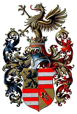 Blasonierung: Geviert: 1) In Gold ein aufrechter schwarzer Greif. 2) und 3) In Rot je zwei silberne Balken. 4) In Grün (oder Gold) ein roter Schrägbalken, belegt mit einer goldenen Lilie. Auf dem gekrönten Helm mit rechts schwarz-goldenen und links rot-goldenen Decken ein wachsender goldener Greif.