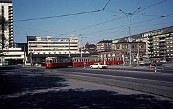 | Wien WVB SL H2 (L4 503 + l + l) Grosse Ungarbrücke am 1. Mai 1976. - Das ältere Gebäude rechts war die Zentrale Fleichhalle (in der Invalidenstrasse). | http://www.bahnbilder.de/bild/oesterreich~stadtverkehr~strasenbahn-wien/596018/wien-wvb-sl-h2-l4-503.html | Kurt Rasmussen | Datei:Wien-wvb-sl-h2-l4-596018.jpg |