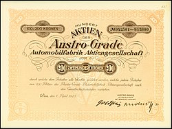 | Sammelaktie über 100 x 200 Kronen der Austro-Grade Automobilfabrik AG vom 1. April 1923 | Sammlung eines Mitglieds des Ersten Deutschen Historic-Actien-Clubs e.V. (EDHAC e.V.); (le) | Unbekannte Autoren und Grafiker; Scan vom EDHAC e.V. | Datei:Austro-Grade Automobilfabrik AG 1923 100x200 Kr.jpg | |