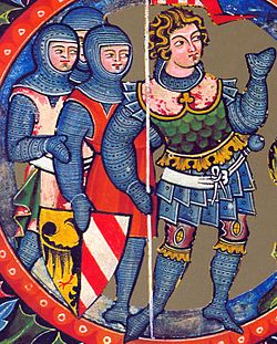 | Azzo von Kuenring und 3 Ritter | http://www.burgenseite.com/faschen/ritter_txt.htm | Ausschnitt aus dem Kuenringer-Stammbaum, fol. 8r im Stifterbuch des Klosters Zwettl („Bärenhaut“), Stiftsarchiv Zwettl, Hs. 2/1 | Datei:Kuenring ritter 01.jpg |