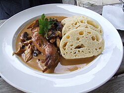 | Kaninchenkeule, Böhmische Klöße, Bratensauce; aufgenommen in Bodenmais, Bayrischer Wald, Adams-Bräu | Eigenes Werk | Claus Ableiter | Datei:Kaninchenkeule und Böhmische Knödel.jpg | |