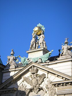 Auf den beiden Kapitellen der Seitenpfeiler findet sich die Aufschrift: ANNO MDCCXXXII, dazwischen der kaiserliche Adler mit dem Wiener Stadtwappen auf der Brust. Ganz oben auf dem flachen Schluss der Stirnwand erhebt sich ein viereckiger Sockel mit der Aufschrift: Imperante Carolo VI. instauravit S.P.Q.V. Zwei auf diesem Sockel stehende Figuren, welche Tapferkeit und Beständigkeit darstellen, tragen eine, mit zwei verschlungenen „C“ und der Zahl „VI“ bezeichnete Kugel. Sieben weitere, eher dekorative Steinfiguren sind darüber hinaus an der Fassade verteilt.