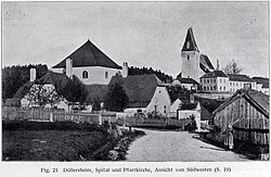 Döllersheim , Spital und Pfarrkirche , Ansicht von Südwesten | Österreichische Kunsttopographie, Band VIII, „Die Denkmale des politischen Bezirkes Zwettl in Niederösterreich (ohne Stift Zwettl), 1. Teil: Gerichtsbezirk Allentsteig“, Wien, 1911 | unbekannter Fotograf | Datei:GuentherZ OeTopo8-1 Doellersheim Kirche Spital 0007.jpg |