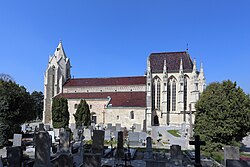 | Südostansicht der Pfarr- und Wallfahrtskirche Mariae Himmelfahrt in der niederösterreichischen Marktgemeinde Bad Deutsch-Altenburg . Die Kirche wurde erhöht über dem Ort auf einer zur Donau steil abfallenden Terrasse errichtet und ist vom Friedhof und einer Umfassungsmauer aus Bruchsteinen umgeben. Das Langhaus ist eine romanische, dreischiffige und sechsjochige Pfeilerbasilika. Der vorgestellte hochgotische Turm im Westen stammt aus dem 3. Viertel des 14. Jahrhunderts. Der erhöhte, zweijochige gotische Chor wurde vermutlich vom Baumeister Michael Knab Ende des 14. Jahrhunderts errichtet. Insgesamt ist das Bauwerk ein bedeutendes Denkmal mittelalterlicher Architektur in Österreich. | Eigenes Werk | C.Stadler/Bwag | Datei:Bad Deutsch-Altenburg - Kirche.JPG | |