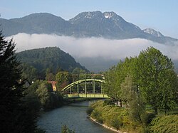 | Berge in Bad Ischl : unter Wolken der Siriuskogl , im Hintergrund die Katrin , im Vordergrund die Traun mit Eisenbahn- und Fußgängerbrücke, aufgenommen in der Maxquellgasse | Eigenes Werk | E. S. Myer . Original uploader was MrsMyer at de.wikipedia | Datei:BadIschlKatrinSiriuskoglTraun.JPG | |