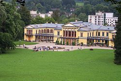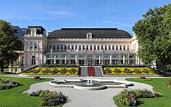 | Das Kongress und Theaterhaus bzw. Kurhaus mit dem Kurpark im Vordergrund in der oberösterreichischen Stadtgemeinde Bad Ischl. Nachdem die Gemeinde das damalige „Pfifferlingfeld“ 1872 angekauft hatte, wurde auf diesem ab 1873 nach Plänen des österr. Architekten Hyazinth Michel (1846–1904) das Kurhaus errichtet und am 30. Mai 1875 in Anwesenheit der Erzherzoge Franz Karl und Ludwig Viktor mit einem Festbankett eröffnet. Während eines Umbaus brach in der Nacht des 25. Februar 1965 ein Brand aus, der das Kurhaus weitgehend zerstörte. Beim Wiederaufbau wurden die Außenfassaden und der Kuppeldachstuhl mit geringen Abweichungen in alter Form wieder hergestellt, jedoch die Innenräume wurden zeitgemäß neugestaltet, und am 19. Juni 1966 fand dann die feierliche Wiedereröffnung statt: 1 . Ab 1997 wurde das ehemalige Kurhaus mit einem Kostenaufwand von rund € 15 Mio. renoviert und mit der Operette „Paganini“ wurde am 11. Juli 1999 das in „Kongress & TheaterHaus Bad Ischl“ umbenannte Haus wieder eröffnet: 2 . | Eigenes Werk | C.Stadler/Bwag | Datei:Bad Ischl - Kongress und Theaterhaus.JPG | |