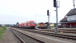 | ÖBB 2016 Doppeltraktion mit einem Güterzug auf der Thermenbahn im Bahnhof Fürstenfeld. Im Hintergrund ist eine ÖBB X630 zu sehen. | Eigenes Werk | Krauselklause | Datei:ÖBB 2016 mit einem Stahlzug auf der Thermenbahn im Bahnhof Fürstenfeld.png |