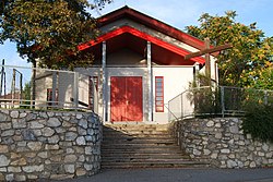 | Eingang zur ehemaligen Barackenkirche in Graz Liebenau (2010) | Eigenes Werk | Moschitz | Datei:Graz Liebenau Barackenkirche Eingang DSC 2577.JPG |