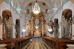 Der Innenraum wird von den seitlichen Wandpfeilern geprägt, die beidseitig je drei kapellenartige Nischen, die mit Seitenaltären versehen sind, bilden. Der Hochaltar stammt vom Grazer Bildhauer Josef Schokotnigg und bildet in einer prunkvollen und reichen Innenraumgestaltung den Höhepunkt.