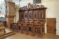Das Chorgestühl aus der Zeit der Benediktiner-Mönche ist eine kostbare, schwere Schnitzarbeit mit gedrehten Säulchen, Muscheln und Fruchtgirlanden, die Abt Roman Wohlrab (1680–1699) anfertigen und mit seinem Wappen krönen ließ.[3] Ursprünglich befand es sich im Presbyterium und steht aktuell (2025) auf der Orgelempore.