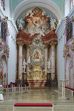 Es besteht ein Zusammenwirken von Stuckmarmor im Chor und bei den Altären und den Wandgemälden. Im Mittelschiff, der Vierung, in den Querarmen und im Chor wirkt das Hauptwerk des Malers Johann Baptist Wenzel Bergl aus 1764/1765, die perspektivisch ausgerichteten Kuppelfresken zeigen einem Marienzyklus Mariä Tempelgang, Vermählung Marias mit Josef, in der Vierung als Höhepunkt Mariä Himmelfahrt in einer Komposition mit einem Figurenkranz, in den Pendentifs die vier römischen Kirchenväter, im Chor Krönung Mariens, in den Querschiffarmen je ein Ovalbild, links Mariä Heimsuchung, rechts Mariä Verkündigung, über dem Musikchor Himmelsglorie mit musizierenden Engeln, im Mittelschiff an den Wänden je zwei große Scheintafeln in gemalten die gemalte Gebälkzonen überschneidenden und von Engeln gehaltenem Rahmen Szenen aus der Kindheit Jesu mit Anbetung der Hirten, Beschneidung des Herrn, Anbetung der Könige und Christus unter den Schriftgelehrten, begleitet wird die Malerei durch eine Architekturmalerei mit gemalten Fenstern an den Querarmen und der Illusion einer Rundumdurchfensterung.