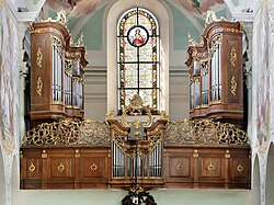 Die Orgel mit 18 Registern, verteilt auf zwei Manuale und Pedal, in einem barocken Gehäuse aus dem Jahr 1770 baute Anton Škrabl 1998.
