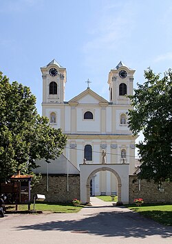 Der große barocke Bau wurde im 17. und 18. Jahrhundert errichtet. Die Doppelturmfassade ist eine breite zweigeschoßige Wand mit Pilastergliederung mit mittigem Hauptportal. Die Eisenbeschläge der Portalflügel sind eine Wiener Arbeit aus dem Jahre 1691. Es gibt eine Nischenfigur der hl. Barbara, in den Seitenachsen unten die Figuren der heiligen Könige Stephan und Ladislaus, oben zwei Kirchenväter. Die zur mächtigen Fassadenfront eher schmächtigen Turmgeschoße tragen heute niedrige Zeltdächer und die Darstellung der Anna selbdritt und einen Servitenheiligen in den Nischen.