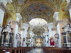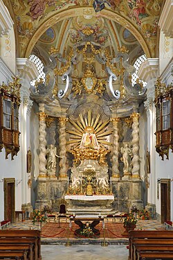 Im Mittelpunkt des Hochaltars steht eine spätgotische Marienstatue von 1465, welche aus dem Stift Rein stammt. 1695 wurde sie durch eine barocke Ummantelung von Bernhard Echter zur Gnadenmutter umgestaltet. Über ihr befindet sich eine Inschrift, die von Engeln getragen wird: Solatium vitae nostrae (Trost unseres Lebens). Die Deckengewölbe, die Kuppel und die Seitenwände des Kircheninnenraumes sind mit Fresken von Lukas von Schram und Johann Baptist Scheidt von 1733 bis 1754 ausgestattet. In einer Darstellung wird an den entscheidenden Sieg Österreichs über die Türken erinnert. Der Kaiser blickt mit seinen Feldherren dankend gen Himmel. Engel halten den Namen Mariä in ihren Händen.
