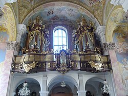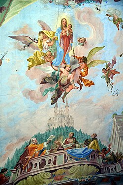 Im Kuppelfresko wird die Gottesmutter Maria als Himmelskönigin verehrt und vom Licht der Heiligen-Geist-Taube umstrahlt. Am Kuppelfuß finden sich Abbildungen der vier Evangelisten, an den Gewölbeauflagern die vier abendländischen Kirchenväter: Gregor der Große, Hieronymus, Ambrosius und Augustinus. In den Seitenkapellen der Basilika werden die Geschichten des Wallfahrtsortes mit Maria als Helferin und Trösterin gezeigt.