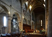Der heutige Sakralbau besteht aus unterschiedlichen Bauabschnitten. Der ursprüngliche Südturm, im 12. Jahrhundert errichtet, war um einiges älter als der Nordturm aus dem Jahr 1333. Die Vorhalle der Basilika stammt aus der ersten Hälfte des 13. Jahrhunderts. Im 14. und 15. Jahrhundert wurden die Seitenschiffe eingewölbt. Die Einwölbung des Mittelschiffes mit einem Sternrippengewölbe erfolgte um 1480/1500.[3]