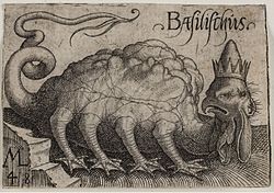 | Melchior Lorck: "Basilischus" (Basilisk), Radierung 42 x 62 mm, aus dem Jahr 1548 | Statens Mseum for Kunst (National Gallery of Denmark) http://www.smk.dk/udforsk-kunsten/soeg-i-smk/#q=basilisk%2Cbasilisk%2Cbasilisk | Melchior Lorck (1548) | Datei:Melchior Lorck, Basilisk (1548).jpg | |