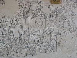 | Detail of gothic fresco Siege of Belgrade (1456) in Church of Immaculate Conception of Virgin Mary in Olomouc (in Czech: kostel Neposkvrněného početí Panny Marie church) ( Czech Republic ) from 1468 (founded in 1983 or in 1985) is probably the oldest depiction of the battle. There is Giovanni da Capistrano in the centre. | Eigenes Werk | Michal Maňas | Datei:Fresco siege of Belgrade 1456 in Olomouc detail.jpg | |