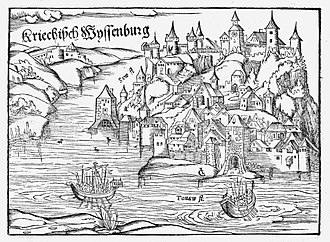 | Die Angaben hier sind von vorne bis hinten fehlerhaft. Cosmographia von 1545 vgl. de.wikisource.org/wiki/Sebastian_Münster#Cosmographia bzw. https://digital.ub.uni-duesseldorf.de/ihd/content/thumbview/193967 enthält keine S. 999. Holzschnitt zum Text Kriechisch Weyssenburg wird belagert in der Basler Cosmographia von Sebastian Münster, Türkische Belagerung von Belgrad 1456. | Holzschnitt auf S. 999 (DCCCVCIV) der "Cosmographia" von 1545 | Sebastian Münster. Orjen at de.wikipedia | Datei:Kriechisch Wyssenburg.jpg | |