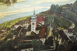 | Panorama der Stadt Salzburg von Johann Michael Sattler, 1825–1829. Panoramamuseum des Salzburg Museums. Detail: Stift Nonnberg | Eigenes Werk (Photo: 2013) | Johann Michael Sattler | Datei:Salzburg Sattler-Panorama Stift Nonnberg.jpg | |