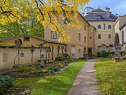 | Der südliche Vorhof des Stift Nonnberg beherbergt einen kleinen Friedhof. | Eigenes Werk | Isiwal | Datei:Salzburg Stift Nonnberg Friedhof-1909.jpg |