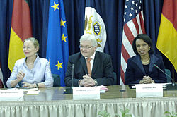 | Secretary Condoleezza Rice with German Foreign Minister Frank-Walter Steinmeier and European Commissioner for External Relations and European Neighborhood Policy Benita Ferrero-Waldner at the U.S.-EU Energy CEO Forum. | U.S Department of State, Ensuring a Sound Energy Future at the U.S.-EU Energy CEO Forum | Michael Gross | Datei:Ferrero-Wadner - Steinmeier - Rice 2007 03 19 jt EUfm 600.jpg | |