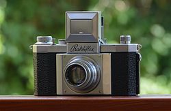 | Praktiflex, 1. Generation (1939); die weltweit dritte in Serie produzierte einäugige Kleinbildspiegelreflexkamera | Eigenes Werk | Dnalor 01 | Datei:Praktiflex, 1st generation 4.jpg |