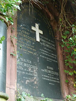 Begräbnisplatte des Erbbegräbnisses mit Benno Constanz von Heineccius (1830 - 1910) Jenny von Heineccius geb. Pohl (1837 - 1890) Walter von Heineccius (1866 - 1894) Benno von Heineccius (1864 - 1908) auf dem Luisenkirchhof II, Erbbegräbniswand / Südmauer, Grab SE 38, Königin-Elisabeth-Str. 46-60, 14059 Berlin | Eigenes Werk | Mattze1975 | Datei:Begräbnistafel Benno Constanz von Heineccius und Familie.jpg |