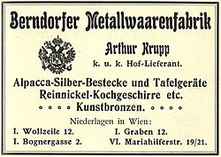 | Werbung von der Berndorfer Metallwarenfabrik , Ausschnitt aus dem Genealogischen Taschenbuch der adeligen Haeuser Oesterreichs 1906/07. | unbekannt | Datei:Genealogisches Taschenbuch der adeligen Haeuser Oesterreichs 1906 2-3 Berndorfer.jpg |