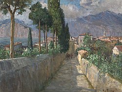 | Gässchen in Malcesine, um 1900/1905, Öl auf Leinwand, 53 x 70 cm, Belvedere, Wien, Inv.-Nr. 727 | Belvedere Museum , Wien | Bertha von Tarnóczy | Datei:Tarnoczy-Malcesine.jpg |