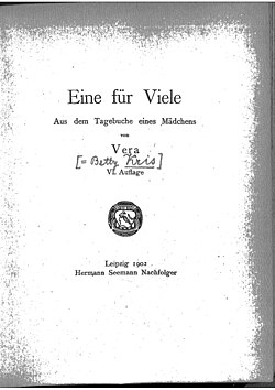 | TItle page of Betty Kurth née Kris book "Eine für Viele", 1900 | Betty Kurth: Eine für Viele | Betty Kurth borne Kris | Datei:Betty Kurth Vera Seite 06.jpg | |