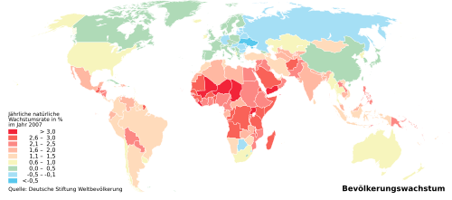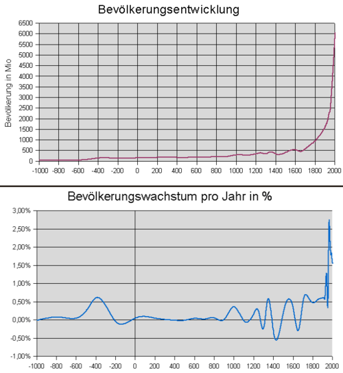Kennzeichnend für die Bevölkerungsentwicklung der Welt (siehe Weltbevölkerung), insbesondere die der letzten 200 Jahre, war ein hyperexponentielles Wachstum (additive Überlagerung mehrerer Exponentialverteilungen), weshalb man mitunter auch von Bevölkerungsexplosion (siehe Überbevölkerung), spricht. Seit dem Wendepunkt 1962/63 sinkt hingegen die Wachstumsrate. Der absolute Zuwachs ist relativ konstant und liegt seit 40 Jahren bei ca. 1,5 Mio. Menschen pro Woche.[1]