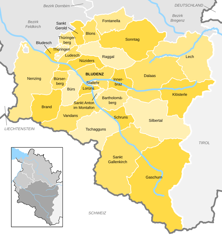 Der Bezirk umfasst 29 Gemeinden, darunter eine Stadtgemeinde (Bludenz) und zwei Marktgemeinden (Nenzing und Schruns).
