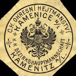 | Siegelmarke Titel: Bezirkshauptmannschaft - Kamenitz Beschreibung: Briefsiegel, schwarz, grau Ort: Kamenitz Größe: 4 cm | http://www.veikkos-archiv.com/index.php?title=Datei:W0216469.jpg | Autor/-in unbekannt Unknown author | Datei:Siegelmarke Bezirkshauptmannschaft - Kamenitz W0216469.jpg |