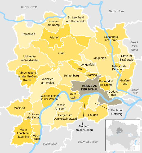 Zum Bezirk Krems gehören 30 Gemeinden, darunter vier Städte und 20 Marktgemeinden.
