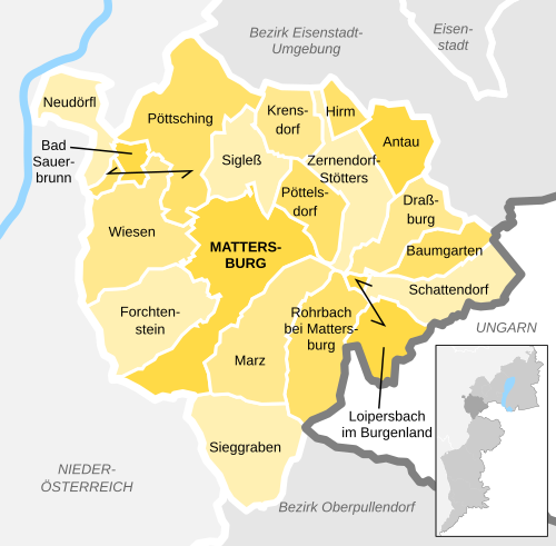 Der Bezirk Mattersburg umfasst 19 Gemeinden, darunter eine Stadt und fünf Marktgemeinden.