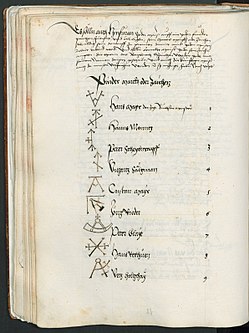 | Brandings of the Bozen-Bolzano's coopers (Fassbinder, Küfer) from 1518 | Early modern ms. from 1518, via BOhisto (free licensed under CC 4) | Autor/-in unbekannt Unknown author | Datei:HS 140 fol 64v Fassbinder 1518 (2).jpg | |