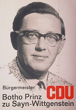 | Bürgermeister Botho Prinz zu Sayn-Wittgenstein CDU Abbildung : Porträtfoto Plakatart : Kandidaten-/Personenplakat mit Porträt Objekt-Signatur : 10-001: 1224 Bestand : Plakate zu Bundestagswahlen (10-001) GliederungBestand10-18 : Plakate zu Bundestagswahlen (10-001) » Die 5. Bundestagswahl am 19. September 1965 » CDU » Mit Porträtfoto Lizenz : KAS/ACDP 10-001: 1224 CC-BY-SA 3.0 DE | Diese Datei wurde Wikimedia Commons freundlicherweise von der Konrad-Adenauer-Stiftung im Rahmen eines Kooperationsprojektes zur Verfügung gestellt. | CDU | Datei:KAS-Sayn-Wittgenstein-Hohenstein, Botho Prinz zu-Bild-2047-1.jpg |