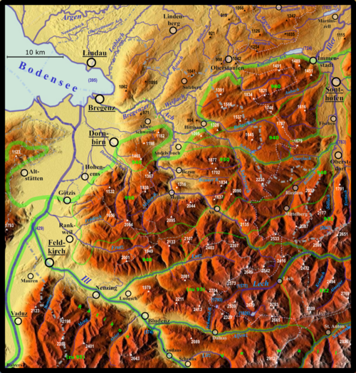 | Relief des Bregenzerwaldgebirges und des Lechquellengebirges (S); mit im Ausschnitt auch der Westflügel der Allgäuer Alpen mit den Allgäuer Nagelfluh-Schichtkämmen (NO). Inhaltsverzeichnis 1 Beschreibung 2 Verwaltungsgrenzen 3 Städte und Gemeinden 4 Naturräume 5 Berghöhen 6 Gewässerhöhen 7 Wasserscheiden 8 Lizenz Verwaltungsgrenzen Die Verwaltungsgrewnzen sind hierarchisch jeweils im Faktor 1,4 bzw. 0,7 zueinander strukturiert: Staatsgrenzen, z. B. am Bodensee (links oben) zwischen Lindau und Bregenz, in der Dicke 0,8 px Grenzen zwischen deutschen Bundesländern, z. B. die Grenze Bayerns zu Baden-Württemberg westlich und nördlich von Lindau, in 0,56 px Grenzen zwischen Regierungsbezirken in D, Kantonen in CH (Westen) und Ländern in A (Grenze zwischen Vorarlberg und Tirol im östlichen Süden) in 0,4 px Kreisgrenzen in D und Bezirksgrenzen in A (in Bodenseenähe z. B. zwischen Bregenz und Dornbirn) in 0,28 px Städte und Gemeinden Kreisstädte und kreisfreie Städte in D sowie Bezirkshauptstädte in A und Kantonshauptstädte in CH sind unterstrichen. Die Gemeinden sind je nach Verdreifachung der Einwohnerzahlen im Faktor 1,25 bzw. 0,8 strukturiert, siehe z. B.: Lindau, Bregenz sowie, an der Iller, Sonthofen, haben mehr als 15.000 Einwohner und Schriftgröße 2,5 (und sind als Kreisstädte unterstrichen) Oberstdorf im Osten und südlich von Sonthofen hat mehr als 5.000 Einwohner und Schriftgröße 2 Fischen zwischen Oberstdorf und Sonthofen hat mehr als 1.500 Einwohner und Schriftgröße 1,6 Die Einwohnerzahlen beziehen sich dabei auf geschlossene Besiedlungen, nicht auf nominelle Verwaltungsgemeinschaften. Naturräume Alpenrandgrenze und Naturraumhauptgrenzen nach Hansjörg Dongus 1991/1993 (Blatt 187 Lindau) in Grün; "landläufige" Gebirgsgruppengrenzen ( AVE und SOIUSA ), die von Naturraumgrenzen abweichen, sind gestrichelt eingezeichnet. Die grünen Zahlen stehen für (vgl. Naturräumliche Feingliederung nach Hormann und Dongus ): 91...: Teile der Östlichen Zentralalpen 931 Allgäuer Kalkalpen (auf Blatt 187 Lindau noch Nr. 930) 932 Lechtaler Alpen 940 Vorarlberger und Westallgäuer Flyschalpen 950 Vorarlberg-Allgäuer Quintner- und Schrattenkalkgewölbe 960 Allgäuer Nagelfluh-Schichtkämme Berghöhen Die eingezeichneten Berghöhen sind die von (nach Höhe absteigend; nachgestellte Naturraumnummern nach Dongus, vgl. naturräumliche Feingliederung nach Hormann und Dongus ): 2912: Pfunspitzen , Verwall 2836: Hochkarspitze , Verwall 2809: Valluga , 932.3 2769: Vallesinspitze , 932.3 2753: Untere Wildgrubenspitze , Lechquellengebirge 2704: Rote Wand , Lechquellengebirge 2679: Spuller Schafberg , Lechquellengebirge 2665: Wasenspitze , Lechquellengebirge 2651: Hohes Licht , 931.4 (Blatt Lindau: 930.2, nachträglich korrigiert) 2649: Braunarlspitze , Lechquellengebirge 2643: Zimba , Vandanser Steinwand, Zimba-Gruppe, Rätikon 2599: Biberkopf , 931.4 (Blatt Lindau: 930.2, nachträglich korrigiert) 2573: (Westlicher) Johanneskopf , Lechquellengebirge 2542: Mohnenfluh , Lechquellengebirge 2539: Pöngertlekopf (und südöstlich davon Pfaffeneck ), Lechquellengebirge 2533: Großer Widderstein , 931.1 (Blatt Lindau: 930.1, nachträglich korrigiert) 2494: Schwarzer Kranz , 932 2472: Hohe Rappenspitze , 932 2416: Karhorn , Lechquellengebirge 2413: Formarin-Schafberg , Lechquellengebirge 2403: Zitterklapfen , 931.1 (Blatt Lindau: 930.1, nachträglich korrigiert) bzw. Lechquellengebirge 2401: Fundelkopf , Fundelkopf-Gruppe, Rätikon 2397: Hochkünzelspitze , 931.1 (Blatt Lindau: 930.1, nachträglich korrigiert) bzw. Lechquellengebirge 2387: Elferkopf , 931.1 (Blatt Lindau: 930.1, nachträglich korrigiert) 2329: Fensterlewand , Lechquellengebirge 2286: Ochsenkopf , Galina-Gruppe, Rätikon 2230: Hoher Ifen , 950.2 2211: Gamsfreiheit , Lechquellengebirge 2198: Galinakopf , Galina-Gruppe, Rätikon 2177: Alpgundkopf , 931.1 (Blatt Lindau: 930.1, nachträglich korrigiert) 2135: Üntschenspitze , 940.11 2133: Glatthorn , 940.12 2123: Kuegrat , Drei-Schwestern-Kette, Rätikon 2107: Zafershorn , 940.12 2095: Dalmülser Mittagsspitze , 950.4 2090: Diedamskopf , 950.3 2089: Itonskopf , Verwall 2081: Breithorn , Lechquellengebirge 2044: Kanisfluh , 950.4 2037: Fellhorn , 940.10 2004: Hoher Freschen , 950.6 2001: Tälispitze ( Walserkamm ), 940.12 1979: Hoher Fraßen , Lechquellengebirge 1949: Pfrondhorn , 940.12 1877: Winterstaude , 950.5 1834: Hochgrat , 960.1 1834: Hirschberg , 950.5 1830: Mörzelspitze (und, unmittelbar nordöstlich, Leuenkopf , 950.6 1821: Rindalphorn , 960.1 1793: Hoher Kasten , Alpsteingruppe 1791: Himmelschrofen , von 931.4 (Blatt Lindau: 930.2, nachträglich korrigiert) nachträglich zu 931.3 (nachträglich geschaffene Einheit) 1787: Riedberger Horn , 940.00 1746: Siplinger Kopf , 960.2 1702: Luguntenkopf , 950.5 1679: Besler , 950.1 1656: Vorderhörnle , 940.6 1645: Feuerstätterkopf , 940.01 1637: Mittagsfluh , 950.3 1616: Rangiswanger Horn , 940.00 1566: Hochhäderich , 960.1 1537: Koppachstein , 960.2 1532: Schöner Mann , 950.6 1491: Eckhalde (Muttner Höhe), 960.00 1489: Immenstädter Horn , 960.00 1463: Hochälpele , 940.03 1451: Mittagberg , 960.1 1391: Fluh , 960.01 1367: Weißenfluh , 950.6 1328: Hittisberg , 960.3 1316: Gopf , 950.5 1254: Salmeser Höhe , 022'.3 1244: Hauchenberg , 022'.2 1198: Geißkopf , 940.03 1182: Brüggelekopf , 940.03 1126: Ochsenberg , 022*.3 (aber auf Kamm von 022*.2) 1123: Anhöhe bei St. Anton , Gäbris-Schichtkämme 1115: Rottachberg , 024'.0 1095: Hirschberg , 020'.0 1095: Stangstattkopf , 960.4 1066: Riedholzer Kugel , 022*.0 1062: Pfänder , 020'.0 1042: Staufner Berg , 021'.7 (aber auf Kamm von 022'.3) 1041: Sulzberg , 021'.2 1035: Kühberg , 022'.4 998: Kapf , 021'.7 (aber auf Kamm von 022'.3) 994: Rotenberg , 021'.5 971: Schneiderkopf , 021'.1 921: Balzerberg , 021'.08 (aber auf dem Kamm von 022'.0) 919: Laubenberg , 022*.0 Gewässerhöhen Von den Fließgewässern sind die wichtigsten beschriftet, die Standgewässer können üb
