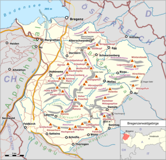 | Übersichtskarte des Bregenzerwaldgebirges . | Eigenes Werk Map was created using: Open Street Map Austria location map.svg for location map | Hauptkarte: Pechristener Austria location map.svg : NordNordWest , Lencer | Datei:Bregenzerwaldgebirge.png | |