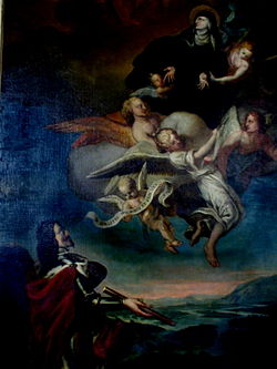 Im Vordergrund dargestellt ist also Erzherzog Leopold Wilhelm oder Kaiser Ferdinand III. im Harnisch, umgeben von einem roten Mantel mit Hermelinkragen, kniend vor der hl. Brigitta. Sein Blick ist auf die Erscheinung gerichtet und lenkt damit den Betrachter in diese Richtung. In der rechten Hand trägt er den Kommandostab in schlichter Ausführung. Darüber, von einer Puttengruppe getragen, schwebt die hl. Brigitta, in der Nonnentracht des Brigittaordens. In Bildaufbau her steht die Darstellung ganz in der Tradition des frühbarocken Votivbildes. Das Bild wurde in weiterer Folge stark übermalt.
