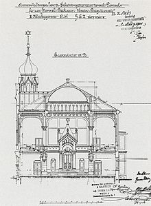 | Die Synagoge in der Kluckygasse, Querschnitt, Baupläne von Jakob Gartner. | Genée, Pierre: Wiener Synagogen 1826-1938 . Wien 1987 | Anonym Unknown author | Datei:Synagoge Kluckygasse Plan.jpg |
