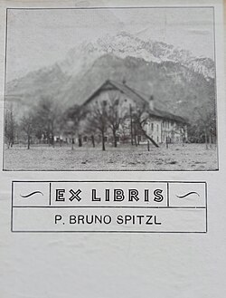 | Spitzl war gebürtig aus Böhmen, kam aber mit 10 Jahre nach Salzburg in die Schule. Das Exlibris zeigt ein Bauernhaus vor einer Alpenlandschaft. | Homiletisches Handbuch für Missionen, Missionserneuerungen, Exerzitien, Oktaven und Triduen, Religionsvorträge in Standesvereinen von Kassiepe, Max. 1922. | Alkuin Schachenmayr | Datei:Spitzl Exlibris.jpg |