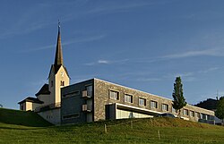 | Pfarrkirche Hll. Petrus und Paulus in Buch , daneben das neue Gemeindeamt. Erbaut 2004 von walser + werle architekten zt gmbh . | Eigenes Werk | böhringer friedrich | Datei:GemeindeamtBuch2.JPG | |
