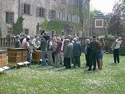 | Würdigung von Prof. Armbrusters Lebenswerk durch APIMONDIA-Präsident Jörgensen im Kloster Bronnbach | Eigenes Werk Humboldt55 | Humboldt55 | Datei:Würdigung Buckfastbiene1 PICT2453.JPG |