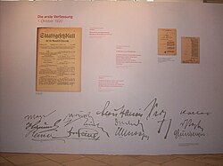 | Foto des Originals des Bundes-Verfassungsgesetzes 1920 und den dazugehörigen Unterschriften in der Ausstellung "90 Jahre Bundesverfassung" 2010 in Wien. | Eigenes Werk | Glorfindel Goldscheitel | Datei:B-VG Ausstellung.JPG | |