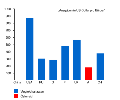 Das Bundesheer musste seit Jahren mit einem im internationalen Vergleich sehr geringen Budget auskommen. Für das Jahr 2019 waren 0,57% des österreichischen BIPs vorgesehen. Im Vergleich dazu betrug in der EU der Durchschnitt 1,3% des BIPs[114]. Durch die zu geringe Finanzierung des Bundesheeres hat sich ein Investitionsrückstau ergeben. Gefordert wurde schon damals zumindest 1% des BIPs, was bereits Helmut Zilk, der im Jahr 2004 der Vorsitzende der Bundesheerreformkommission war, verlangt hatte.[115]